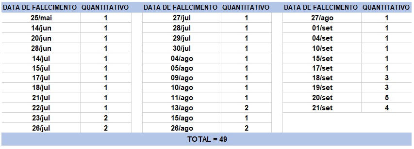O boletim epidemiológico de hoje contabiliza 49 óbitos que ocorreram em diversas datas, conforme tabela abaixo. A existência de registros tardios e/ou acúmulo de casos deve-se a sobrecarga das equipes de investigação, pois há doenças de notificação compulsória para além da Covid-19. Outro motivo é o aprofundamento das investigações epidemiológicas por parte das vigilâncias municipais e estadual a fim de evitar distorções ou equívocos, como desconsiderar a causa do óbito um traumatismo craniano ou um câncer em estágio terminal, ainda que a pessoa esteja infectada pelo coronavírus.