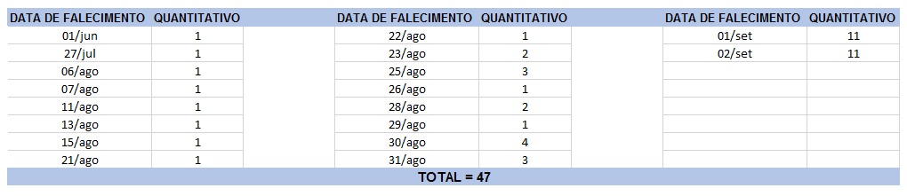 O boletim epidemiológico de hoje contabiliza 47 óbitos que ocorreram em diversas datas, conforme tabela abaixo. A existência de registros tardios e/ou acúmulo de casos deve-se a sobrecarga das equipes de investigação, pois há doenças de notificação compulsória para além da Covid-19. Outro motivo é o aprofundamento das investigações epidemiológicas por parte das vigilâncias municipais e estadual a fim de evitar distorções ou equívocos, como desconsiderar a causa do óbito um traumatismo craniano ou um câncer em estágio terminal, ainda que a pessoa esteja infectada pelo coronavírus.