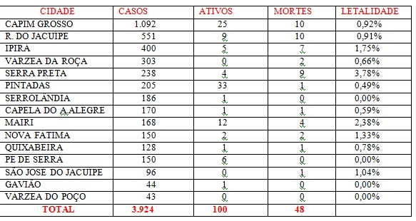 Mas o município com a maior taxa de letalidade na Bacia do Jacuípe até o momento é Serra Preta, 9 óbitos dos 238 casos confirmados o que representa 3,78%, acima das taxas no Brasil (2,99%), Nordeste (2,96%) e Bahia (2,18%).