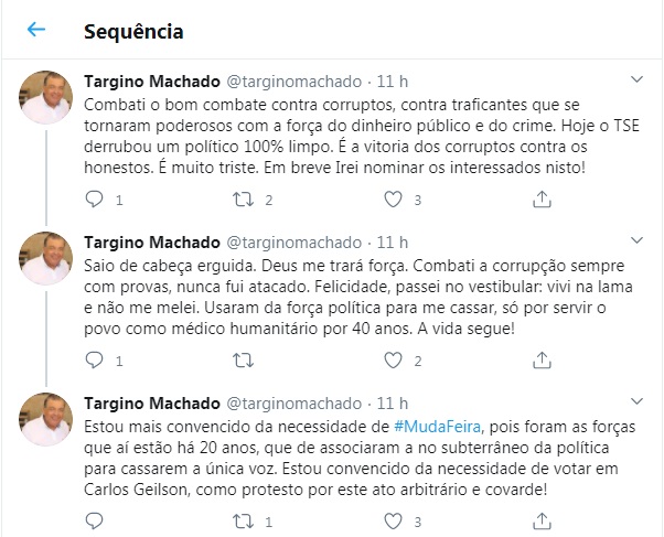 Na sequência de mensagens, o ex-deputado disse também que a decisão o deixou mais convencido da necessidade de “#MudaFeira”, pois “as forças que aí estão há 20 anos se associaram ao subterrâneo da política para cassarem a única voz”. Ele apoia a candidatura do ex-deputado estadual Carlos Geilson (Podemos), rival de seu correligionário e ex-prefeito do município, José Ronaldo (DEM).