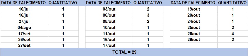 O boletim epidemiológico de hoje contabiliza 29 óbitos que ocorreram em diversas datas, conforme tabela abaixo. A existência de registros tardios e/ou acúmulo de casos deve-se a sobrecarga das equipes de investigação, pois há doenças de notificação compulsória para além da Covid-19. Outro motivo é o aprofundamento das investigações epidemiológicas por parte das vigilâncias municipais e estadual a fim de evitar distorções ou equívocos, como desconsiderar a causa do óbito um traumatismo craniano ou um câncer em estágio terminal, ainda que a pessoa esteja infectada pelo coronavírus.