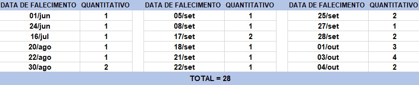 O boletim epidemiológico de hoje contabiliza 28 óbitos que ocorreram em diversas datas, conforme tabela abaixo. A existência de registros tardios e/ou acúmulo de casos deve-se a sobrecarga das equipes de investigação, pois há doenças de notificação compulsória para além da Covid-19. Outro motivo é o aprofundamento das investigações epidemiológicas por parte das vigilâncias municipais e estadual a fim de evitar distorções ou equívocos, como desconsiderar a causa do óbito um traumatismo craniano ou um câncer em estágio terminal, ainda que a pessoa esteja infectada pelo coronavírus.