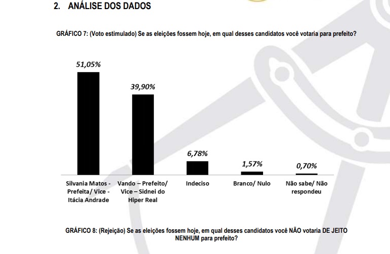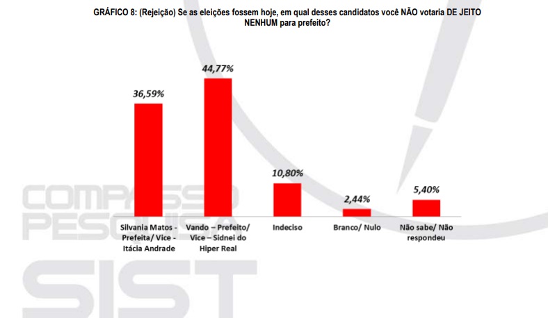 A segunda pergunta foi sobre rejeição. O entrevistador perguntou: Se as eleições fossem hoje, em qual desses candidatos você não votaria de jeito nenhum para prefeito. Neste cenário o atual prefeito Vando aparece na frente com 44,77% enquanto sua opositora Silvania aparece com 36,59% de rejeição. 10,80% estão indecisos, 2,44% se manifestaram para votar branco ou anular e 5,40% não sabe/não respondeu.