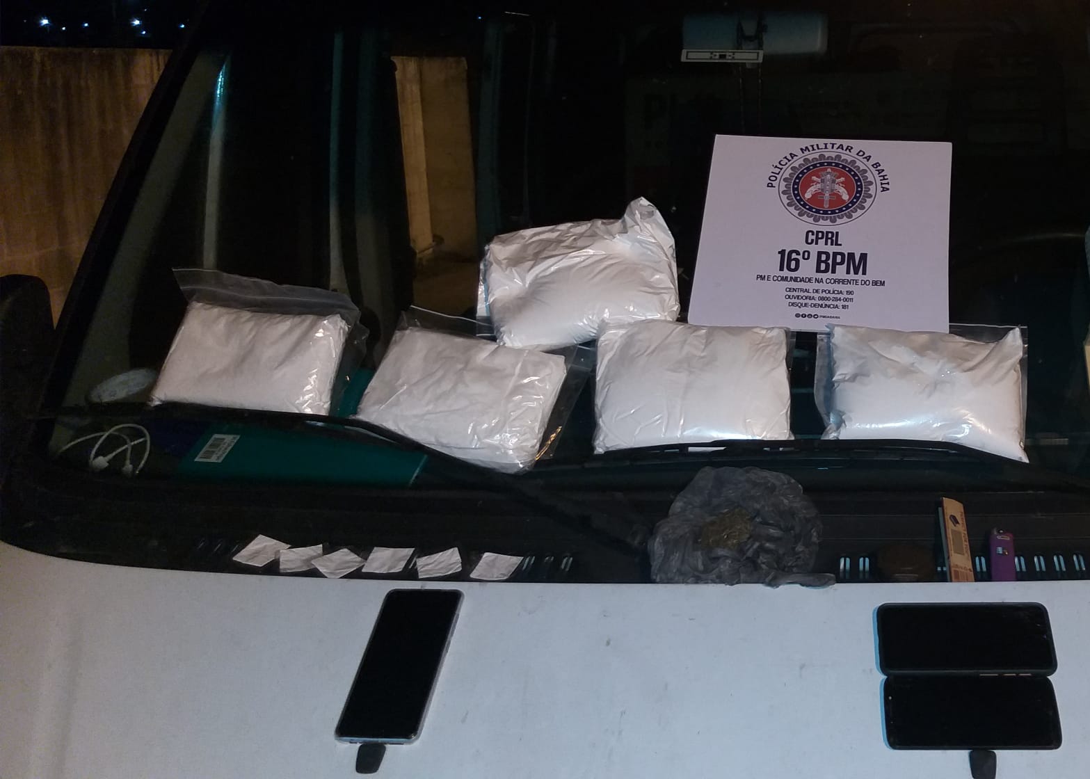 A abordagem aconteceu por volta das 03h e os policiais localizaram em poder da dupla seis papelotes de substância aparentando ser cocaína; 05 pacotes de aproximadamente um quilo contendo uma substância aparentando ser cocaína; um pequeno tablete prensado de substância aparentando ser maconha, com papel de cigarro e um triturador; além de três celulares, marcas Xiomi, Samsung e Motorolla, sem contudo, identificar proprietário do material apreendido.