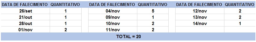 O boletim epidemiológico de hoje contabiliza 20 óbitos que ocorreram em diversas datas, conforme tabela abaixo