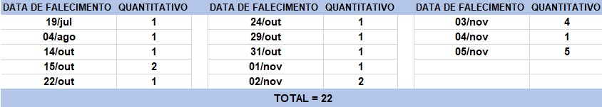 O boletim epidemiológico de hoje contabiliza 22 óbitos que ocorreram em diversas datas, conforme tabela abaixo. A existência de registros tardios e/ou acúmulo de casos deve-se a sobrecarga das equipes de investigação, pois há doenças de notificação compulsória para além da Covid-19. Outro motivo é o aprofundamento das investigações epidemiológicas por parte das vigilâncias municipais e estadual a fim de evitar distorções ou equívocos, como desconsiderar a causa do óbito um traumatismo craniano ou um câncer em estágio terminal, ainda que a pessoa esteja infectada pelo coronavírus.