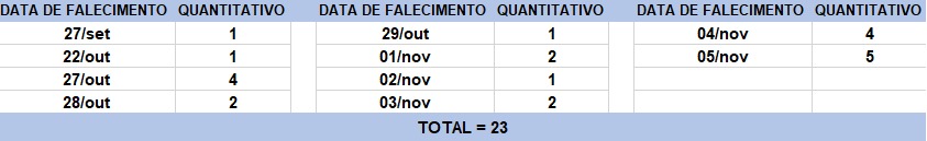O boletim epidemiológico de hoje contabiliza 23 óbitos que ocorreram em diversas datas, conforme tabela abaixo. A existência de registros tardios e/ou acúmulo de casos deve-se a sobrecarga das equipes de investigação, pois há doenças de notificação compulsória para além da Covid-19. Outro motivo é o aprofundamento das investigações epidemiológicas por parte das vigilâncias municipais e estadual a fim de evitar distorções ou equívocos, como desconsiderar a causa do óbito um traumatismo craniano ou um câncer em estágio terminal, ainda que a pessoa esteja infectada pelo coronavírus.