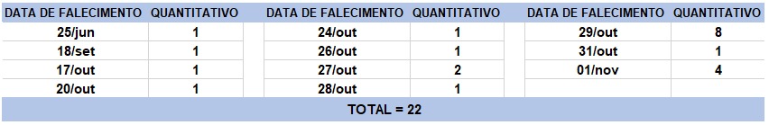 O boletim epidemiológico de hoje contabiliza 22 óbitos que ocorreram em diversas datas, conforme tabela abaixo. A existência de registros tardios e/ou acúmulo de casos deve-se a sobrecarga das equipes de investigação, pois há doenças de notificação compulsória para além da Covid-19. Outro motivo é o aprofundamento das investigações epidemiológicas por parte das vigilâncias municipais e estadual a fim de evitar distorções ou equívocos, como desconsiderar a causa do óbito um traumatismo craniano ou um câncer em estágio terminal, ainda que a pessoa esteja infectada pelo coronavírus.