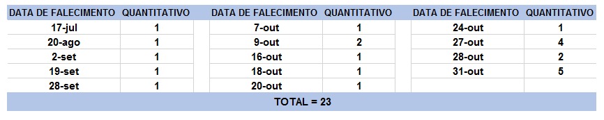 O boletim epidemiológico de hoje contabiliza 23 óbitos que ocorreram em diversas datas, conforme tabela abaixo. A existência de registros tardios e/ou acúmulo de casos deve-se a sobrecarga das equipes de investigação, pois há doenças de notificação compulsória para além da Covid-19. Outro motivo é o aprofundamento das investigações epidemiológicas por parte das vigilâncias municipais e estadual a fim de evitar distorções ou equívocos, como desconsiderar a causa do óbito um traumatismo craniano ou um câncer em estágio terminal, ainda que a pessoa esteja infectada pelo coronavírus.