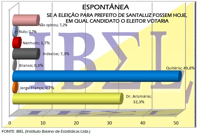 Na pesquisa espontânea quando o entrevistador pergunta ao eleitor(a) se as eleições fossem hoje, em quem ele(a) votaria para prefeito(a) de Santaluz, não citando nome do candidato(a) e o resultado foi 49,8% para Quitéria, 32,3% Dr. Arismário, 0,7% Jorge França. Os indecisos são 7,3%, nenhum 1,7%, nulo 0,7%, branco 0,3%, não opinou 7,2%.