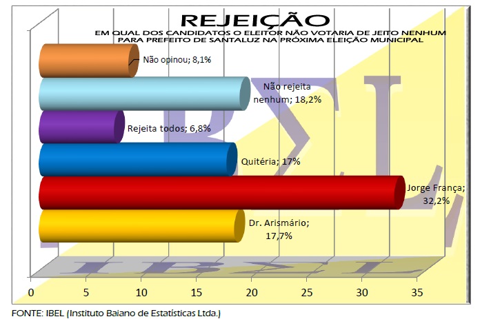 Foi perguntado também sobre a rejeição dos candidato (as). De acordo com a pesquisa Jorge França do Democracia Cristã (DC) tem maior rejeição, aparece com 32,2%, seguido de Dr. Arismário com 17,7% e Quitéria com 17% neste cenário mostra o empate técnico entre os dois melhores posicionados na pesquisa geral.Veja outras informações sobre rejeição no gráfico abaixo.