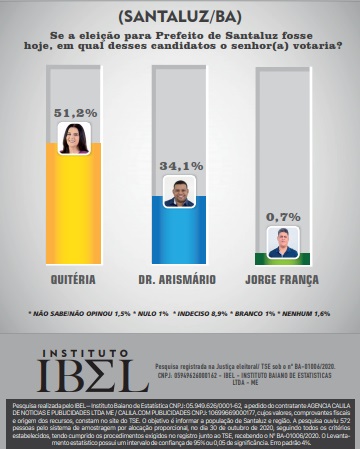 A pesquisa realizada pelo Instituto Baiano de Estatísticas – IBEL inscrita no CNPJ: 05.949.626/0001-62 contratada pela Agencia Calila de Notícias e Publicidades Ltda – ME CNPJ 10.699.669/0001-77 foi registrada no dia 30 de outubro no Tribunal Superior Eleitoral (TSE) sob o número BA-01006/2020 com data para divulgação a partir do dia 5 de novembro. No entanto, a coligação Liberta Santaluz que tem como candidato a prefeito Dr. Arismário (Avante) entrou com uma representação na Justiça Eleitoral requerendo a suspensão da divulgação e conseguiu uma liminar que suspendeu a mesma. A IBEL apresentou sua defesa, assim como a Agência Calila, dentro do prazo estabelecido pela Juíza Lisiane Sousa Alves Duarte da 145ª Zona Eleitoral de Santaluz, que após demonstrado nos autos a regularidade da pesquisa Eleitoral, fora então julgada improcedente a referida Representação e a liminar foi revogada nesta quarta-feira, 11-11-2020, permitindo assim a divulgação da pesquisa – Veja a Sentença