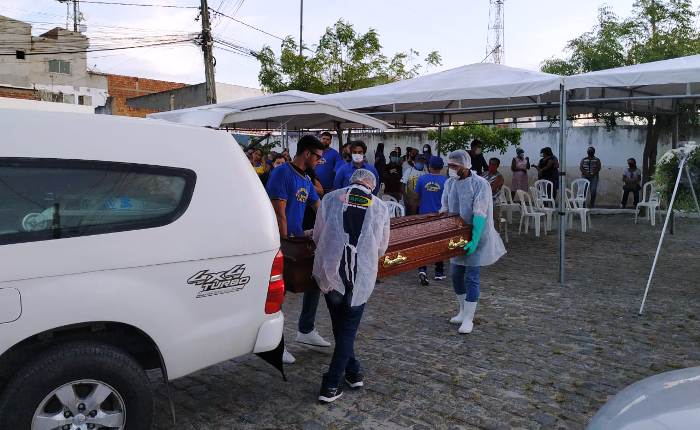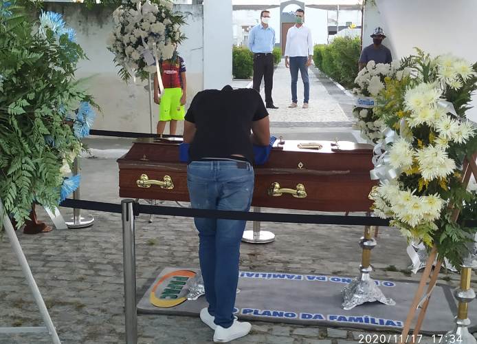 Em frente a necrópole foi montada uma estrutura para receber o caixão os funcionários da funerária com vestes especiais usadas para sepultamento de vítimas da Covid-19 e o neto Daniel tocaram no caixão.