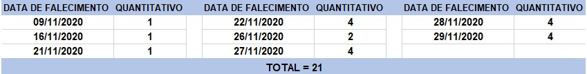 O boletim epidemiológico de hoje contabiliza 21 óbitos que ocorreram em diversas datas, conforme tabela abaixo. A existência de registros tardios e/ou acúmulo de casos deve-se a sobrecarga das equipes de investigação, pois há doenças de notificação compulsória para além da Covid-19. Outro motivo é o aprofundamento das investigações epidemiológicas por parte das vigilâncias municipais e estadual a fim de evitar distorções ou equívocos, como desconsiderar a causa do óbito um traumatismo craniano ou um câncer em estágio terminal, ainda que a pessoa esteja infectada pelo coronavírus.