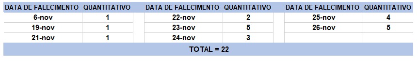 O boletim epidemiológico de hoje contabiliza 22 óbitos que ocorreram em diversas datas, conforme tabela abaixo. A existência de registros tardios e/ou acúmulo de casos deve-se a sobrecarga das equipes de investigação, pois há doenças de notificação compulsória para além da Covid-19. Outro motivo é o aprofundamento das investigações epidemiológicas por parte das vigilâncias municipais e estadual a fim de evitar distorções ou equívocos, como desconsiderar a causa do óbito um traumatismo craniano ou um câncer em estágio terminal, ainda que a pessoa esteja infectada pelo coronavírus.