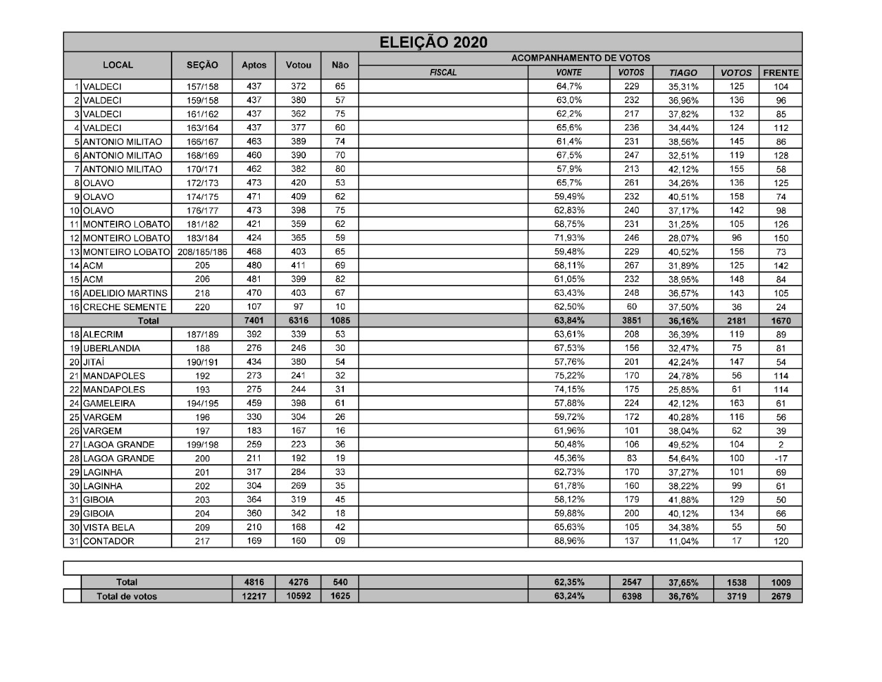 O gráfico abaixo mostra resultado urna por urna, sendo que a eleição mais apertada pra Vonte foi no Povoado Lagoa Grande onde funcionou duas seções, Vonte perdeu em uma e ganhou em outra. Dr Tiago levou a melhor na soma das duas urnas. Vonte 106 – Dr Tiago 104 / Vonte 83 – Dr Tiago 100. O advogado teve 15 de frente.