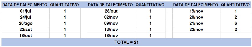 O boletim epidemiológico de hoje contabiliza 21 óbitos que ocorreram em diversas datas, conforme tabela abaixo. A existência de registros tardios e/ou acúmulo de casos deve-se a sobrecarga das equipes de investigação, pois há doenças de notificação compulsória para além da Covid-19. Outro motivo é o aprofundamento das investigações epidemiológicas por parte das vigilâncias municipais e estadual a fim de evitar distorções ou equívocos, como desconsiderar a causa do óbito um traumatismo craniano ou um câncer em estágio terminal, ainda que a pessoa esteja infectada pelo coronavírus.