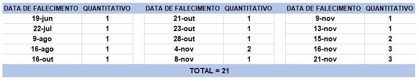 O boletim epidemiológico de hoje contabiliza 21 óbitos que ocorreram em diversas datas, conforme tabela abaixo. A existência de registros tardios e/ou acúmulo de casos deve-se a sobrecarga das equipes de investigação, pois há doenças de notificação compulsória para além da Covid-19. Outro motivo é o aprofundamento das investigações epidemiológicas por parte das vigilâncias municipais e estadual a fim de evitar distorções ou equívocos, como desconsiderar a causa do óbito um traumatismo craniano ou um câncer em estágio terminal, ainda que a pessoa esteja infectada pelo coronavírus.