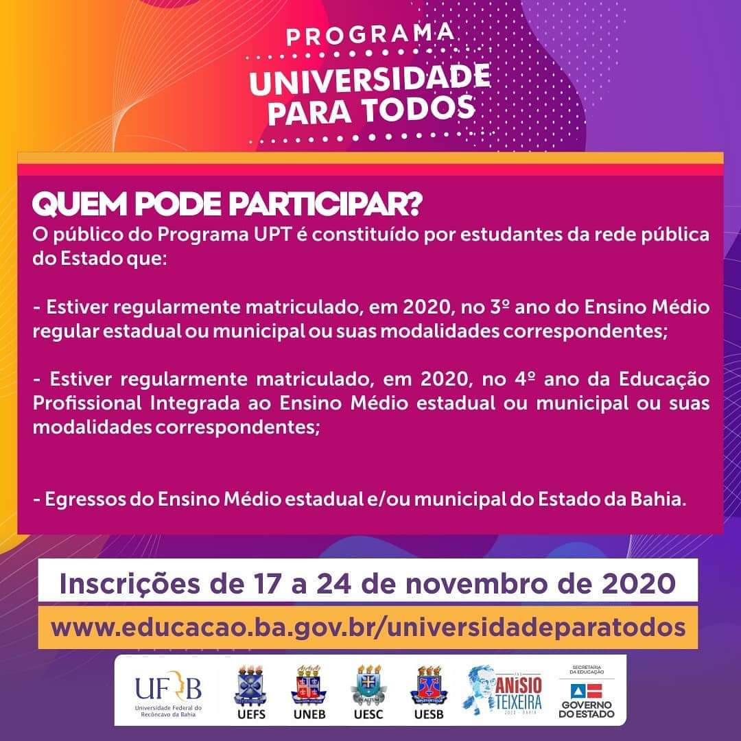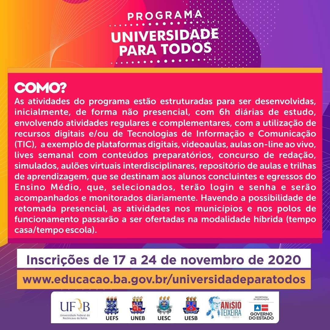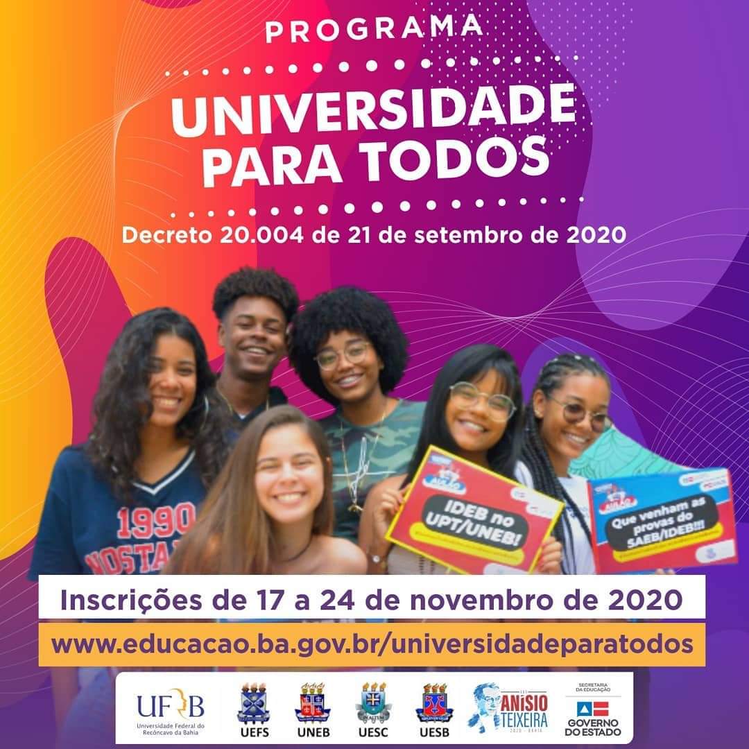 O edital de inscrição já está disponível no site www.educacao.ba.gov.br/universidadeparatodos. Não perca tempo, acesse-o agora mesmo! Para dúvidas sobre a inscrição: 0800 285 8000 / [email protected].