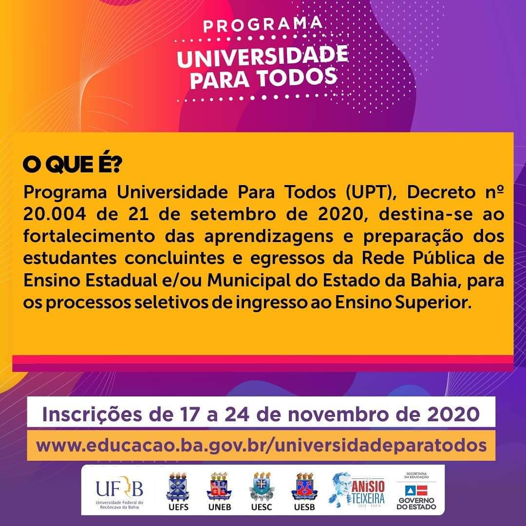 O UPT é um Programa da Secretaria da Educação da Bahia (SEC), executado em parceria com a UNEB, UEFS, UESC, UESB e UFRB. Conta com turmas espalhadas por diversos munícipios da Bahia e, em 2020, oferta 12.105 vagas.
