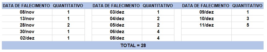 O boletim epidemiológico de hoje contabiliza 28 óbitos que ocorreram em diversas datas, conforme tabela abaixo. A existência de registros tardios e/ou acúmulo de casos deve-se a sobrecarga das equipes de investigação, pois há doenças de notificação compulsória para além da Covid-19. Outro motivo é o aprofundamento das investigações epidemiológicas por parte das vigilâncias municipais e estadual a fim de evitar distorções ou equívocos, como desconsiderar a causa do óbito um traumatismo craniano ou um câncer em estágio terminal, ainda que a pessoa esteja infectada pelo coronavírus.