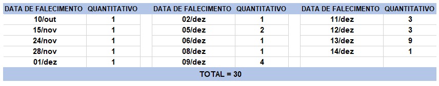O boletim epidemiológico de hoje contabiliza 30 óbitos que ocorreram em diversas datas, conforme tabela abaixo. A existência de registros tardios e/ou acúmulo de casos deve-se a sobrecarga das equipes de investigação, pois há doenças de notificação compulsória para além da Covid-19. Outro motivo é o aprofundamento das investigações epidemiológicas por parte das vigilâncias municipais e estadual a fim de evitar distorções ou equívocos, como desconsiderar a causa do óbito um traumatismo craniano ou um câncer em estágio terminal, ainda que a pessoa esteja infectada pelo coronavírus.