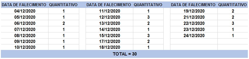 O boletim epidemiológico de hoje contabiliza 30 óbitos que ocorreram em diversas datas, conforme tabela abaixo. A existência de registros tardios e/ou acúmulo de casos deve-se a sobrecarga das equipes de investigação, pois há doenças de notificação compulsória para além da Covid-19. Outro motivo é o aprofundamento das investigações epidemiológicas por parte das vigilâncias municipais e estadual a fim de evitar distorções ou equívocos, como desconsiderar a causa do óbito um traumatismo craniano ou um câncer em estágio terminal, ainda que a pessoa esteja infectada pelo coronavírus.