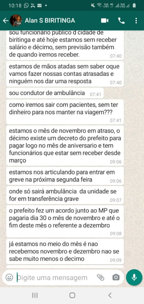 “Nós estamos pra receber o mês de novembro que apesar de todos nossos esforços não recebemos. Entramos em contato com o ministério público que durante uma reunião com ambas as partes e foi feito um acordo para recebermos os salários, décimo terceiro e terço de férias e nada do que foi negociado não foi cumprido”, lembrou Edylmar.