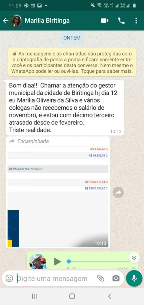 A servidora municipal Arlete Brito questiona o que foi feito com esses os recursos que entraram nos cofres do município, que segundo o Demonstrativo de Distribuição de Arrecadação do Banco do Brasil, o município de Biritinga recebeu 5,8 milhões entre 01/11/2020 a 10/12/2020, o suficiente para pagar todos os funcionários municipais. O pagamento dos servidores deveria ter sido efetuado no máximo em 08 de dezembro, 5° dia útil, mas não houve até o momento este pagamento.