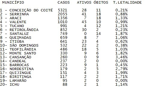 O Calila Notícias fez um levantamento sobre a evolução da Covid-19 nos 20 municípios do território do sisal e concluiu que Conceição do Coité está disparado na frente em relação aos casos confirmados, 5.321 casos, mais que o dobro do segundo colocado, Serrinha 2.055, e mais que o triplo do terceiro, Araci com 1.356.