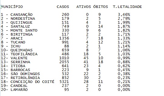 Cansanção que aparece em 13º entre os 20 municípios com 260 casos, no quesito taxa de letalidade vai pra primeiro lugar com 9 óbitos. Veja as duas amostras