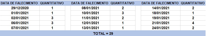 O boletim epidemiológico de hoje contabiliza 29 óbitos que ocorreram em diversas datas, conforme tabela abaixo.