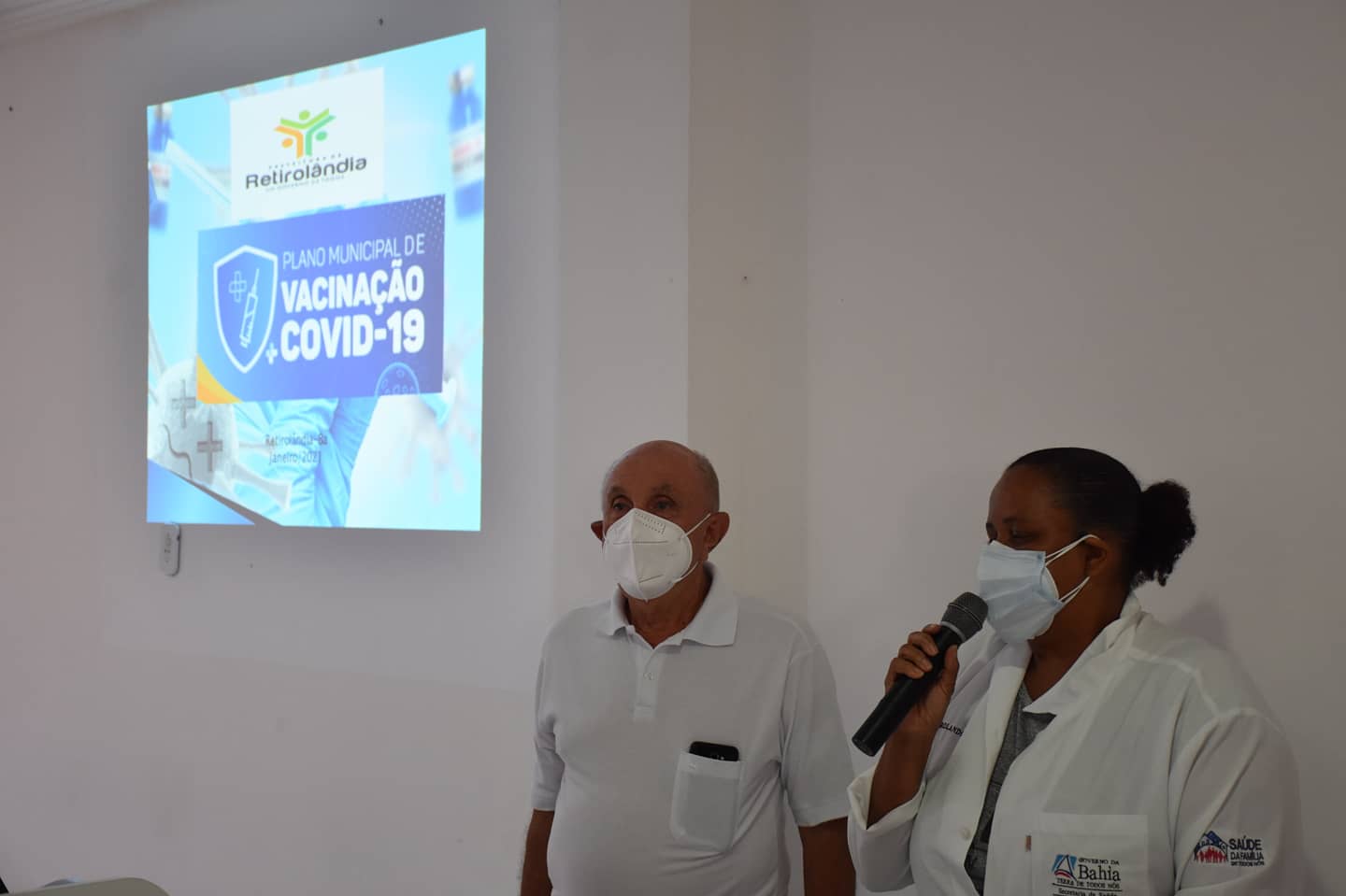 Na tarde desta terça-feira 19, foi realizada na Câmara de Vereadores de Retirolândia a apresentação do Plano Municipal de Vacinação contra à Covid-19. Além da apresentação do plano, foram vacinados a enfermeira e linha de frente na luta contra o corona vírus, Lélia Ferreira e o médico Milton Lobão.