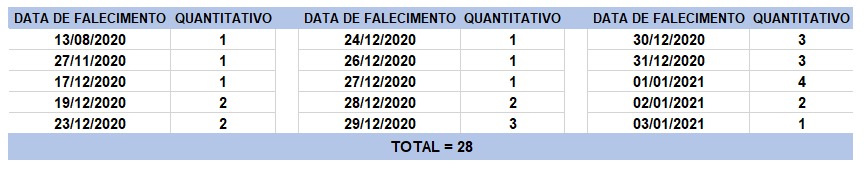 O boletim epidemiológico de hoje contabiliza 28 óbitos que ocorreram em diversas datas, conforme tabela abaixo. A existência de registros tardios e/ou acúmulo de casos deve-se a sobrecarga das equipes de investigação, pois há doenças de notificação compulsória para além da Covid-19. Outro motivo é o aprofundamento das investigações epidemiológicas por parte das vigilâncias municipais e estadual a fim de evitar distorções ou equívocos, como desconsiderar a causa do óbito um traumatismo craniano ou um câncer em estágio terminal, ainda que a pessoa esteja infectada pelo coronavírus.