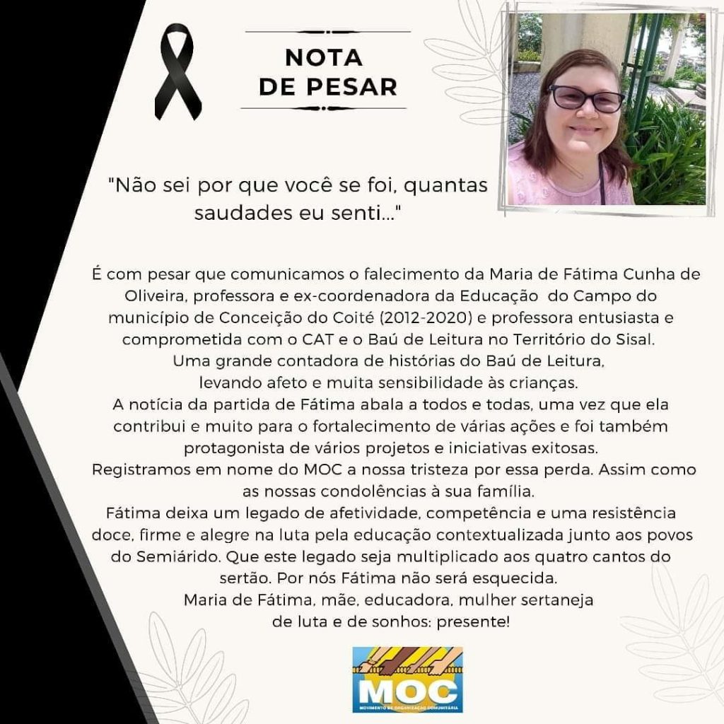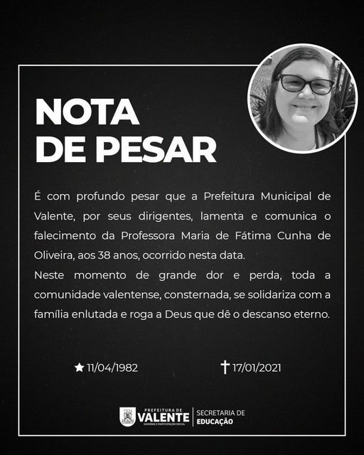Morreu na manhã deste domingo, 17, no Hospital Espanhol, em Salvador, a professora Maria de Fátima Cunha de Oliveira, 38 anos, moradora da cidade de Valente no Território do Sisal.