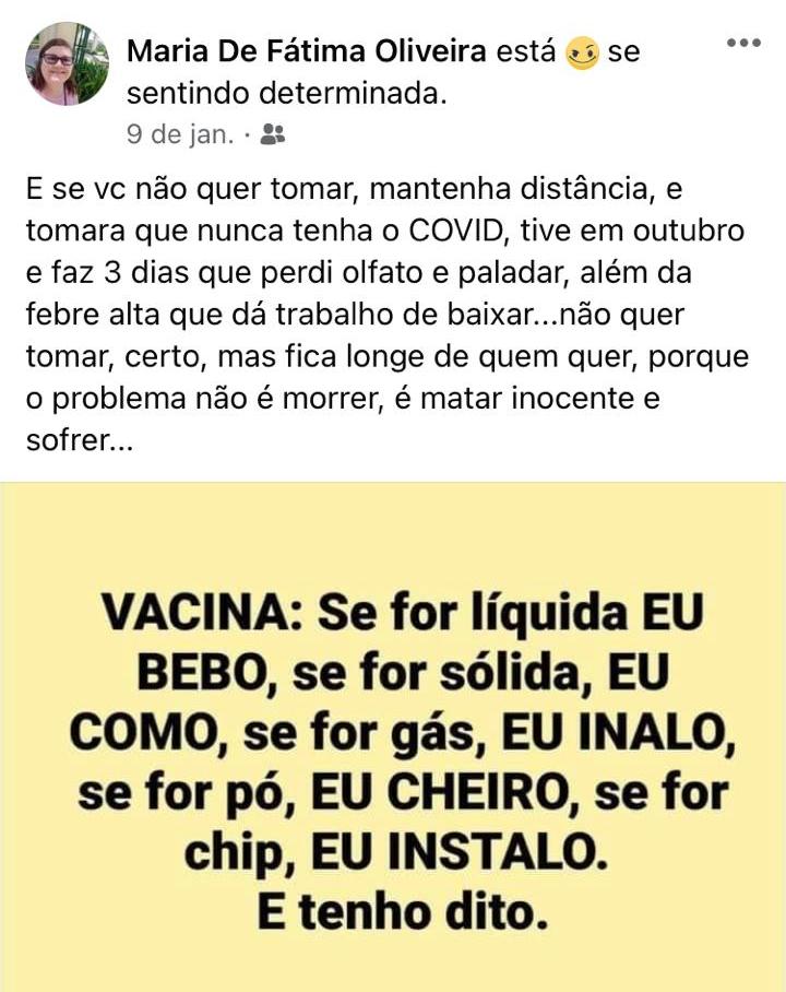 Numa postagem na sua página do Facebook, Maria de Fátima mostra-se muito favorável a vacina para prevenir a Covid-19, e narra o drama de ter perdido o olfato e paladar três meses depois, esta publicação aconteceu no dia 9 de janeiro.