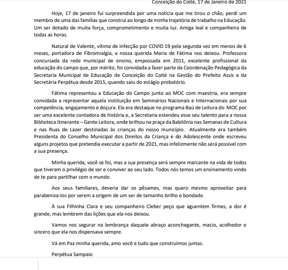 A ex-secretária de Educação do Município de Conceição do Coité, Perpétua Sampaio, lamentou a morte de uma pessoa muito querida e que contribuiu para o fortalecimento da educação de modo especial aos alunos do campo. Perpétua traz também a trajetória do trabalho da educadora por Coité.