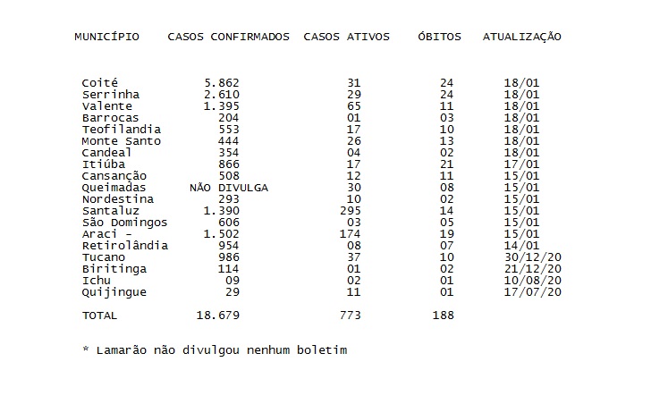 O levantamento foi realizado com base nas atualizações dos boletins da Prefeitura ou Secretaria de Saúde publicados no Facebook. Os municípios de Candeal e Lamarão não tem nenhuma informação sobre a Covid-19. O primeiro município não foi encontrado nenhuma página, Lamarão foi criada uma já nesta nova gestão, porém nada relacionado a Covid-19 foi publicado.