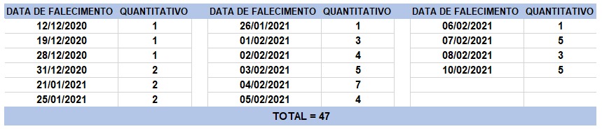 Desde o começo da pandemia, o boletim epidemiológico sobre a Covid-19 divulgado pela Secretaria de Saúde do Estado da Bahia (SESAB) apresentou a maior quantidade de óbitos em único dia em 02 de outubro do ano passado, nesta quinta-feira, 11, foram registrados 47 óbitos, a segunda maior quantidade em único dia desde o começo da pandemia. De acordo com o boletim as mortes ocorreram em datas diferentes, porém esta table a SESAB vem mostrando desde o começo da pandemia e sempre se manteve entre 25 e 35 diários.