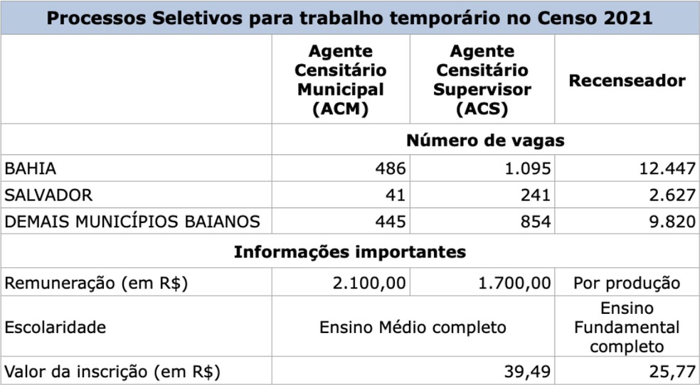 O Instituto Brasileiro de Geografia e Estatística (IBGE) anunciou nesta quinta-feira (17) a realização de concurso público para preencher 14.028 vagas temporárias em todos os 417 municípios da Bahia, para atuar no Censo Demográfico 2021. As oportunidades são para agente censitário municipal agente censitário supervisor e recenseador.