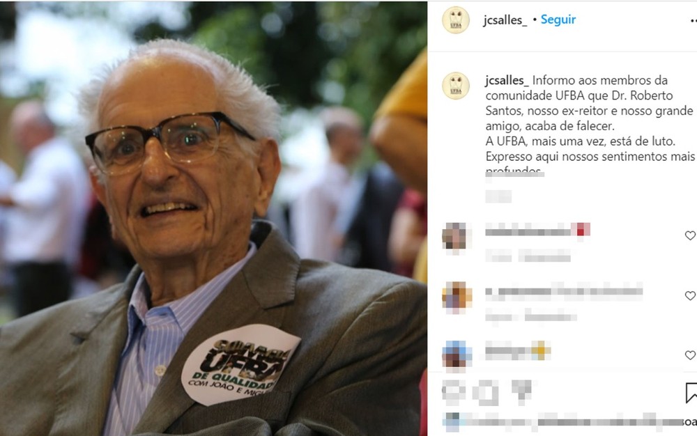 “Informo aos membros da comunidade UFBA que Dr. Roberto Santos, nosso ex-reitor e nosso grande amigo, acaba de falecer. A UFBA, mais uma vez, está de luto. Expresso aqui nossos sentimentos mais profundos”, escreveu o reitor da Ufba, João Carlos Salles, nas redes sociais.