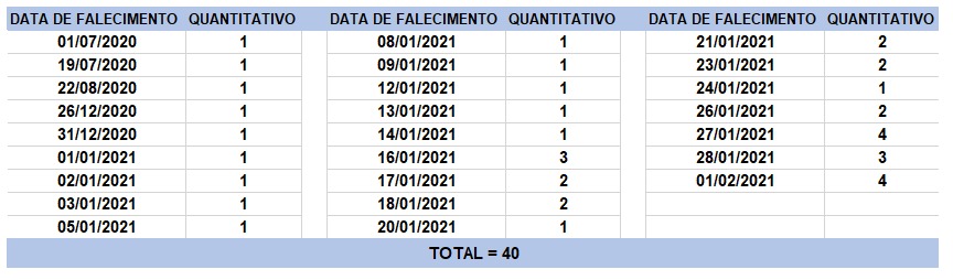 O boletim epidemiológico de hoje contabiliza 40 óbitos que ocorreram em diversas datas, conforme tabela abaixo.