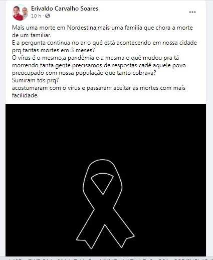 A quantidade de óbitos em Nordestina levou o ex-prefeito Erivaldo Carvalho, que é médico, fazer um questionamento em sua página do Facebook, ele não cita nomes, mas dar a entender que as perguntas são direcionadas aqueles que fizeram oposição ao seu governo encerrado em 31 de dezembro de 2020.