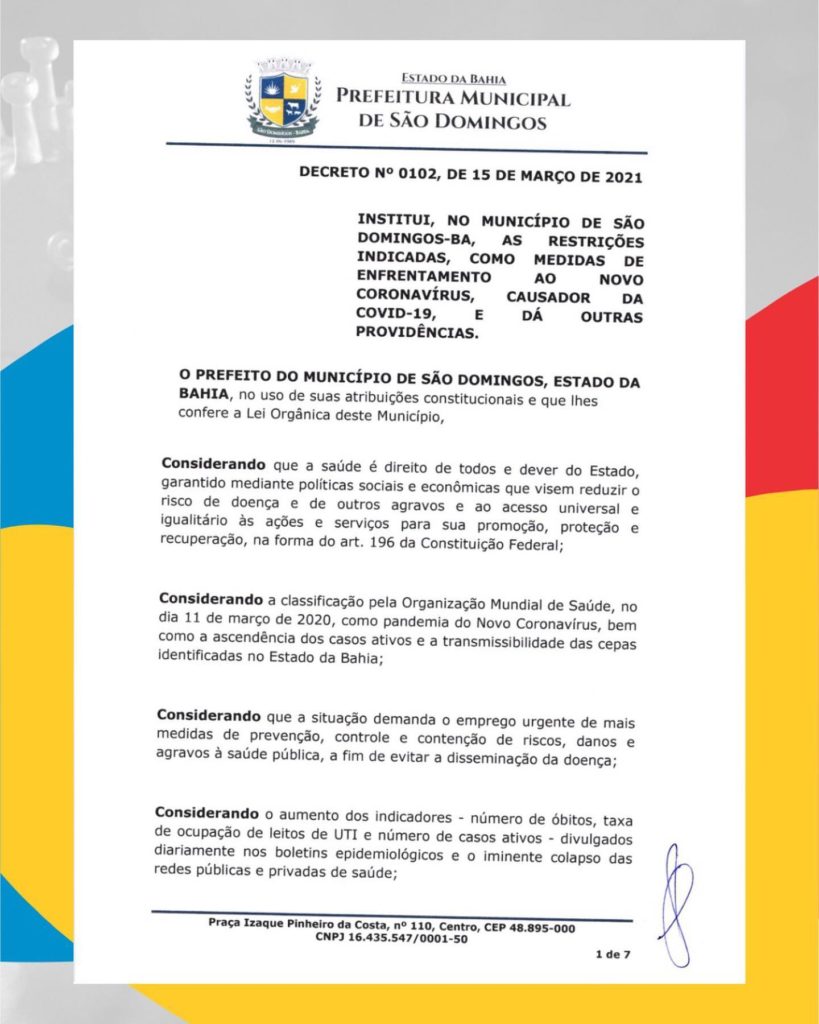 O Município de São Domingos foi o primeiro do território do sisal a registrar caso confirmado da Covid-19, isto em 27 de março do ano passado e de lá para cá por alguns momentos registrou uma quantidade relativamente alta para a realidade do município, mas depois de quase um ano está com um dos menores índices entre os 20 municípios que compõem o território.