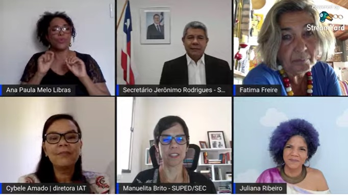 Com mediação da diretora geral do Instituto Anísio Teixeira (IAT), Cybele Amado, ainda estiveram presentes na live a superintendente de Políticas para a Educação Básica da SEC, Manuelita Brito; a secretária de Políticas para as Mulheres do Estado da Bahia, Julieta Palmeira (em vídeo); as estudantes indígenas Ana Beatriz Ká Arfer Jurum Tuxá, Maria Fernanda Ká Arfer Jurum Tuxá e Maria Antonia Ká Arfer Jurum Tuxá; as estudantes Júlia Fernanda e Gabriely Martins; e a cantora e educadora Juliana Ribeiro.