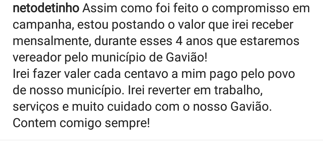 Neto disse em campanha que fará um mandato de forma mais transparente e que automaticamente irá buscar transparência, inclusive apresentou em redes sociais o valor que irá receber de subsídios nos próximos 4 anos.