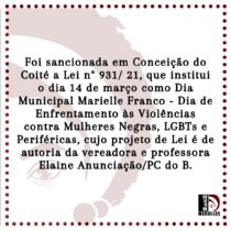 De acordo com o texto: “Fica instituído, no âmbito do Município de Conceição do Coité, o Dia Marielle Franco – Dia de Enfrentamento às Violências contra as Mulheres Negras, LGBTS e Periféricas, a ser celebrado no dia 14 de Março de cada ano, o qual integra o Calendário Municipal de Eventos. A data 14 de março foi o dia da morte da vereadora e do seu motorista.