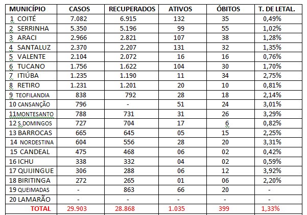 Abaixo uma tabela detalhada com quantidade de casos positivos, recuperados, casos ativos, óbitos e taxa de letalidade. Detalhe: o município de Queimadas não publica quantidade de casos positivos, portanto, aparece apenas um traço por não ter essa definição. O município de Lamarão o traço aparece em todas situações, pois, é o único que não divulga boletim, assim sendo, não é possível saber quantos infectados, recuperados, ativos, mortos e taxa de letalidade.