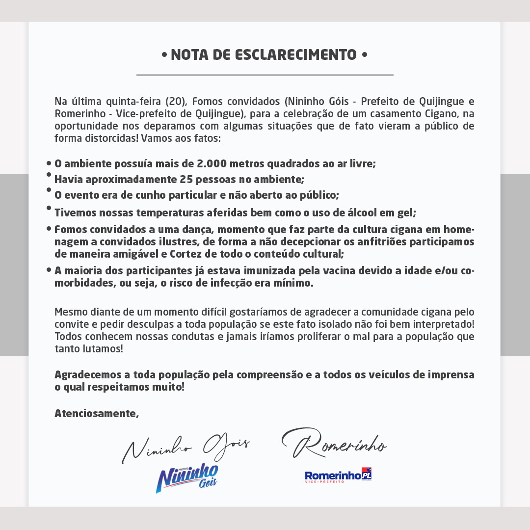 O Calila Notícias publicou na última quinta-feira, 20, uma reportagem referente a participação do prefeito de Quijingie, Nininho Gois e seu vice Romerinho em uma festa cigana no município onde aparecem em vídeos e fotos dançando e posando para fotos em grupos assim como eles sem máscara, algo que estaria desobedecendo o próprio decreto que está em vigor.