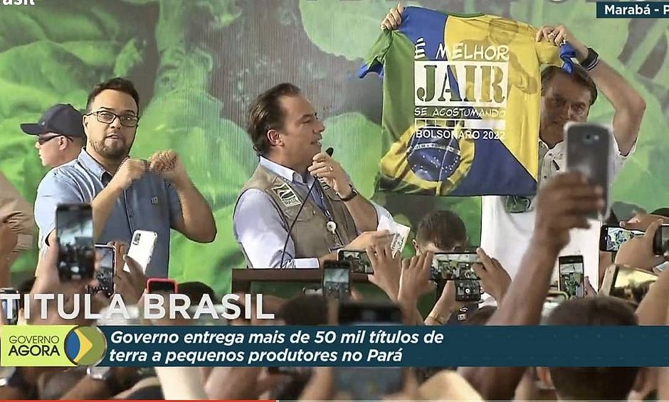 O presidente Jair Bolsonaro exibiu nesta sexta-feira (18) uma camiseta em alusão à campanha de reeleição – o ato aconteceu durante cerimônia de entrega de títulos de propriedade rural em Marabá, no Pará. A camisa tem a foto do presidente com uma bandeira do Brasil e a frase “É melhor Jair se acostumando. Bolsonaro 2022”.